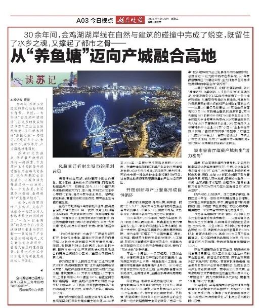 近日,《姑蘇晚報》整版關(guān)注金雞湖商務區(qū)建設(shè)成效,刊發(fā)文章《從“養(yǎng)魚塘”邁向產(chǎn)城融合高地》。