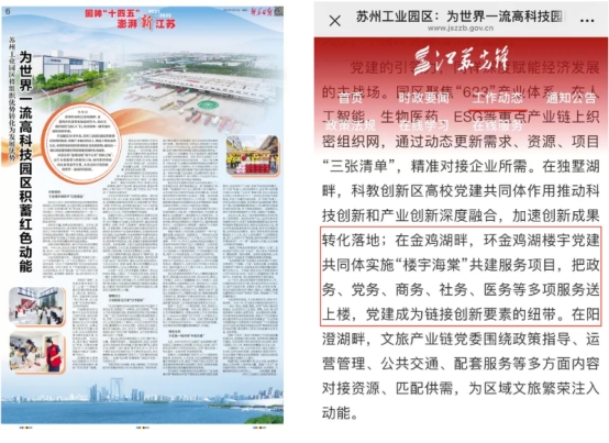 日前,《新華日報》整版關注園區(qū)組織部2025年年度工作,省委組織部官網(wǎng)同步刊載《蘇州工業(yè)園區(qū):為世界一流高科技園區(qū)積蓄紅色動能》全文。文中關注環(huán)金雞湖樓宇黨建共同體實施“樓宇海棠”共建服務項目,把政務、黨務、商務、社務、醫(yī)務等多項服務送上樓,黨建成為鏈接創(chuàng)新要素的紐帶。