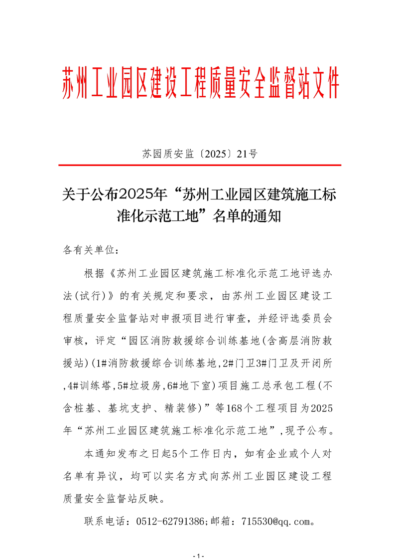 關(guān)于公布2025年“蘇州工業(yè)園區(qū)建筑施工標(biāo)準(zhǔn)化示范工地”名單的通知