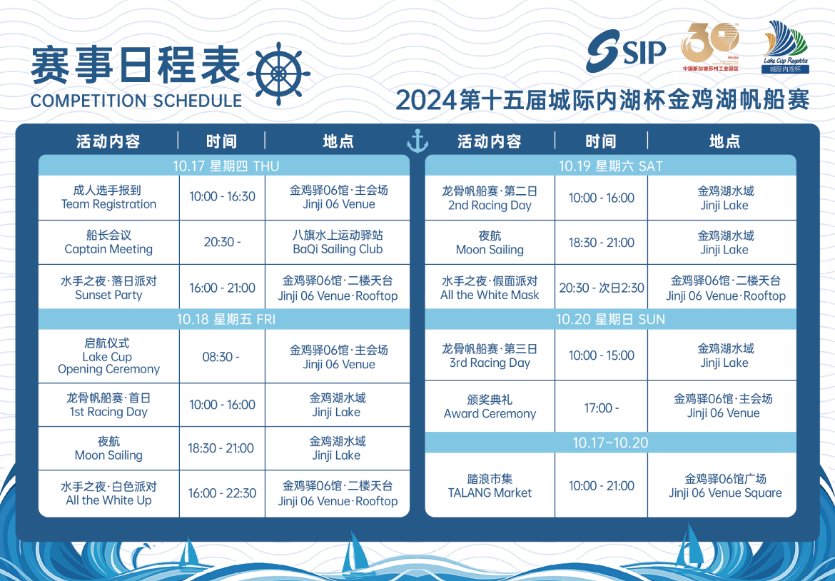 10月18日,第十五屆城際內湖杯金雞湖帆船賽在園區望湖角帆船碼頭正式開賽。中國帆船帆板運動協會副主席劉衛東,蘇州市政府副秘書長謝飛,蘇州市體育局局長闕明清,蘇州工業園區黨工委委員、管委會副主任、宣傳和統戰部部長朱江出席啟航儀式。作為園區三大品牌...