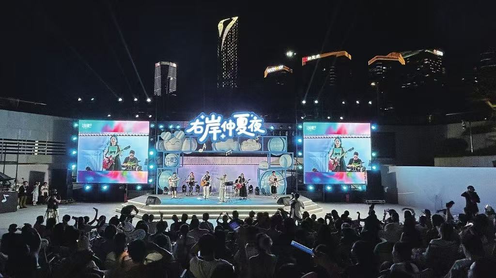 金雞湖畔,晚風依舊火熱。昨晚,“右岸仲夏夜”準時開麥。零渺樂隊7名人氣音樂人接力登臺,用十余首跨越年代與風格的金曲,為觀眾再送60分鐘不間斷的音樂熱浪。