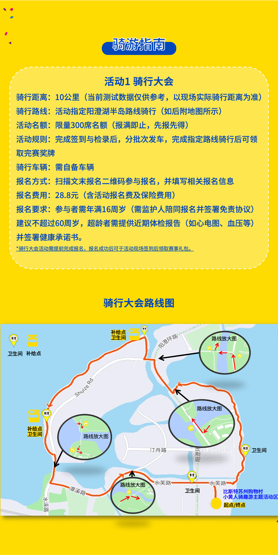 此次活動分為騎行大會、騎趣游體驗兩種形式,騎行大會需自備車輛、按照指定路線騎行,騎行距離約為10公里,參與者需年滿16周歲,完成指定路線騎行后可領取完賽獎牌,報名費用為28.8元;騎趣游體驗也需自備車輛,可在陽澄湖半島旅游度假區(qū)內自由騎行,騎行距離為10公里以上(需出示在陽澄湖半島騎行的GPS路線記錄),完成騎行后可獲得紀念獎牌(限量200席名額),該項活動無需報名,可憑借碼表或手機APP的GPS路線記錄領取紀念獎牌。