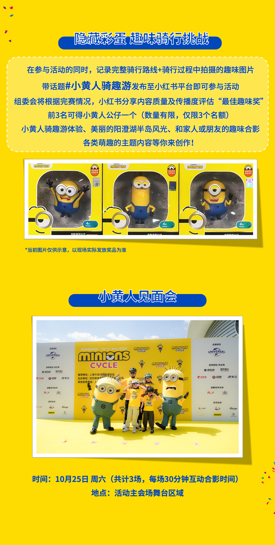 此外,在參與活動的同時,記錄完整騎行路線+騎行過程中拍攝的趣味圖片,帶話題#小黃人騎趣游發(fā)布至小紅書平臺還可參與“隱藏彩蛋趣味騎行挑戰(zhàn)”活動,后續(xù)活動主辦方將根據完賽情況、小紅書分享內容質量及傳播度評估“最佳趣味獎”,前3名可獲得小黃人公仔一個。