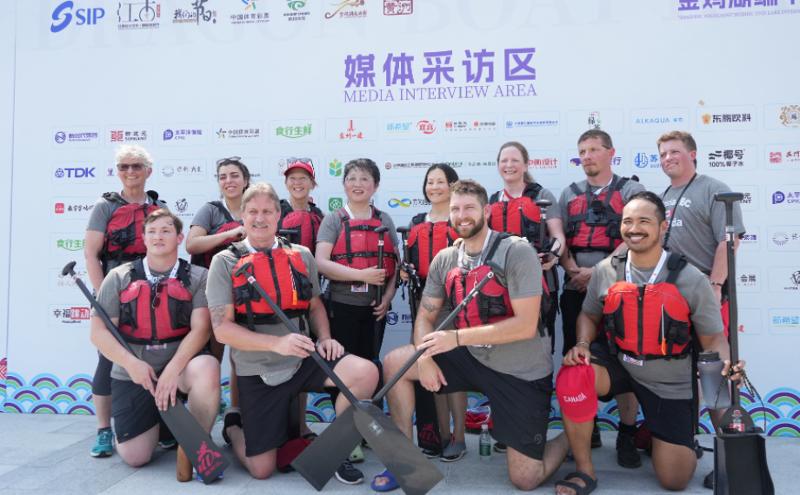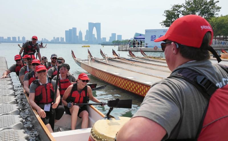 五月的金雞湖畔,陽(yáng)光正好,涼風(fēng)習(xí)習(xí)。2025金雞湖端午龍舟賽開(kāi)賽前夕,一支身著灰色T恤、頭戴“小紅帽”的外籍友人龍舟隊(duì)在月光碼頭亮相,其身影在湖畔格外引人注目,他們就是來(lái)自加拿大維多利亞市的龍舟隊(duì)。隨著鼓點(diǎn)響起,槳葉破開(kāi)粼粼波光,激起層層漣漪,一場(chǎng)跨越萬(wàn)里的龍舟之約就此展開(kāi),這不僅是他們時(shí)隔六年重返蘇州的剪影,更是中加友誼之舟在碧波間續(xù)寫(xiě)的嶄新航跡。