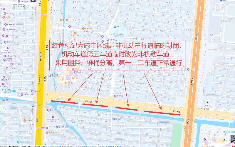 因道路交通導(dǎo)改情況復(fù)雜,該段需分段施工,將南北兩側(cè)分段,預(yù)計(jì)施工工期5天。為保證現(xiàn)場(chǎng)安全,施工期間,施工路段的非機(jī)動(dòng)車(chē)行道臨時(shí)封閉,機(jī)動(dòng)車(chē)道第三車(chē)道臨時(shí)改為非機(jī)動(dòng)車(chē)道,采用圍擋、錐桶分離,非施工人員禁止入內(nèi),第一、二車(chē)道正常通行,請(qǐng)過(guò)往市民按照現(xiàn)場(chǎng)施工標(biāo)志提示有序通行,服從現(xiàn)場(chǎng)疏導(dǎo)人員指揮,小心慢行。如有條件,可盡量提前擇道繞行,給出行帶來(lái)不便,敬請(qǐng)廣大市民諒解。