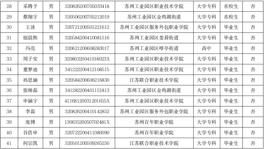 根據省、市征兵工作要求,蘇州工業園區征兵辦按照身體檢查、政治考核、役前教育、集體定兵會等程序,批準了41名應征青年入伍,現將人員名單向社會公布,并接受各界監督。