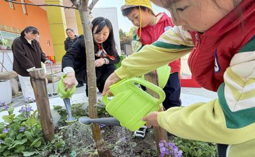 “這棵山楂樹,是彩蓮社區和幼兒園的友誼之樹!”活動現場,社區工作者、幼兒園老師、小朋友們手持小鐵鍬,分工協作、默契配合,小心翼翼地為聯誼山楂樹培土、澆水、扶正。小小的身影認真專注,稚嫩的臉龐滿是期待,老師則在一旁耐心指導,講解植樹的技巧和注意事項。這棵山楂樹,不僅承載著彩蓮社區與蓮花幼兒園的深厚情誼,更寄托著校社攜手培育未來的期許——愿孩子們像小樹苗一樣向陽生長,愿黨建引領下的校社共建之花如樹木般根深葉茂、生生不息。每一勺泥土都凝聚著黨建引領的合力,每一滴清水都澆灌著共育共成長的溫情,歡聲笑語間,這棵承載著初心與希望的聯誼山楂樹,穩穩扎根在社區的沃土上,成為校社共建、共育未來的生動縮影。