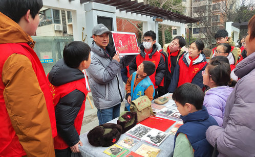 舞臺一側,雷鋒精神主題展區吸引了眾多居民駐足觀看。二十六塊雷鋒事跡宣傳展板圖文并茂,生動再現了雷鋒同志平凡而偉大的一生。展區中央的桌子上,雷鋒像章、書籍、報刊、宣傳畫等珍貴藏品靜靜陳列,訴說著那段火紅的歲月。社區特邀的紅色藏品講解員俯身向前,向圍攏過來的星港學校志愿者學生們講述藏品背后的故事孩子們聽得入神,不時點頭提問。
