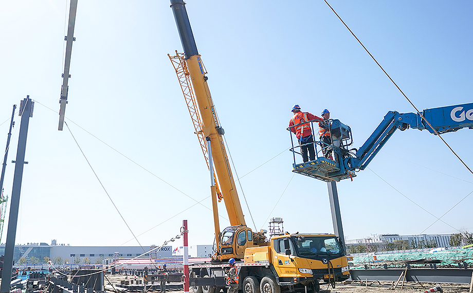 “目前項目進展順利,我們正集中力量進行聯合廠房主結構吊裝工作。”項目現場執行經理代楚光介紹道。未來,這片約158畝的土地上,將崛起總建筑面積7萬多平方米的智能化工廠。為高效推進建設,項目被劃分為四個分區同步施工。“一區當前配備了四臺吊車進行鋼結構組裝,預計兩周內,該區域主結構將全面搭建完成。”