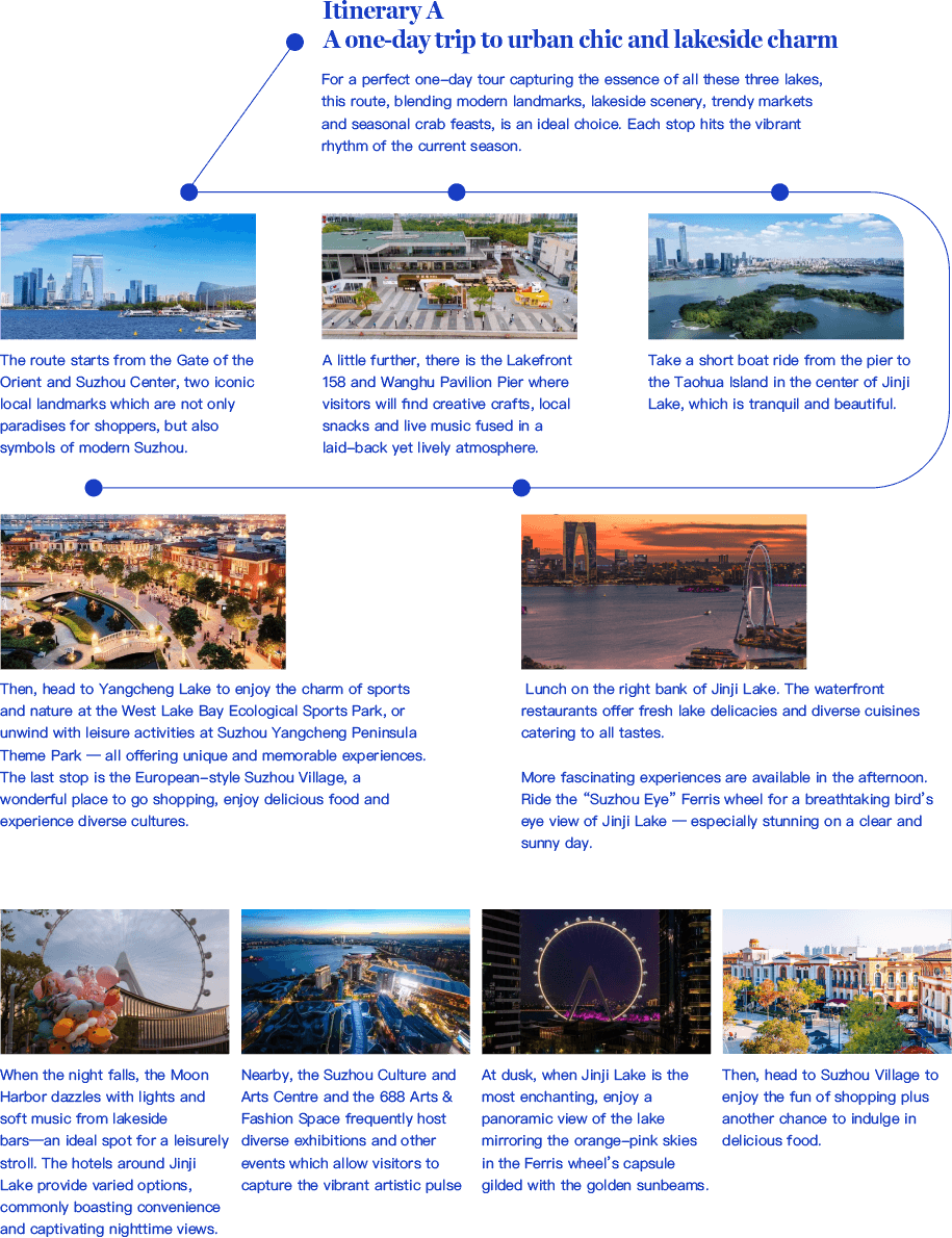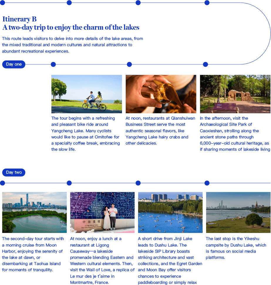 The routes were designed to allow visitors to fullyimmerse themselves in the unique charm of the three lakes in SIP and collectunforgettable memories.“We’ve integrated the most distinctive resources of thethree lakes to offer visitors a richer, more diversified travel experience,”said an official from SIP Culture, Sports and Tourism Office.Highlighting seasonal features, both routes incorporatehairy crab-themed culinary experiences. Moreover, the itineraries integratediverse experiences such as ecological exploration, trendy urban entertainment,cultur... [MORE]