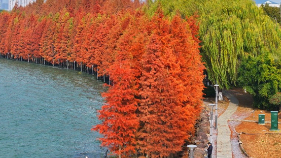 The banks of Xietang River are lined by dawn redwoods. Afternoon sunlight filters through reddish-gold leaves, casting dappled shadows on the path and turning the riverside into a breathtaking oil painting.