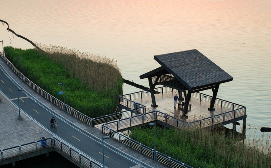 在環(huán)湖自行車(chē)道上,也別忘了留意湖畔那些散落的親水木亭,它們靜靜地探向湖面,是絕佳的歇腳點(diǎn)。